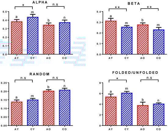 Statistical analysis of the protein component of AY, CY, AO, and CO samples: ALPHA (helix structures), BETA (β sheet structures), RANDOM (random coil structures), and FOLDED/UNFOLDED (folded to unfolded structures). Asterisks indicate statistically significant differences between A and C regions within the same group (n.s. p > 0.05; * p < 0.05; ** p < 0.01). Different lowercase letters over histograms were used to indicate significant differences between Y and O groups (p < 0.05).