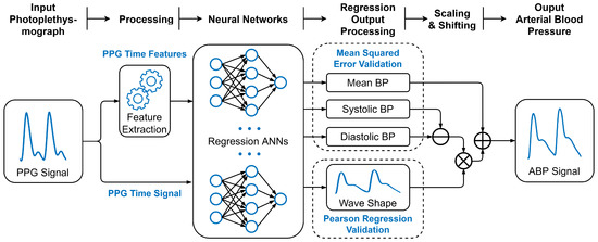 Learning-based methods avoid the derivation of models and physiological constants. Instead, the model learns from a dataset. Kurylyak et al. [7] extracted time domain features of the PPG signal, including the crest time (or systolic upstroke duration), diastolic duration, and the pulse widths at different percentages of the pulse height. This was then used to train an artificial neural network (ANN) for the prediction of the SBP and DBP [7]. The trained model had mean average errors (MAEs) of 3.8 mmHg and 2.2 mmHg for SBP and DBP, respectively. However, this model was trained on a relatively small amount of data, approximately 4 h of waveforms. [7]. The exact number of patients was not stated, but since this study used the original MIMIC database, there could not be more than 90 patients. As such, it is unknown how well this study’s results would generalise to the wider population.