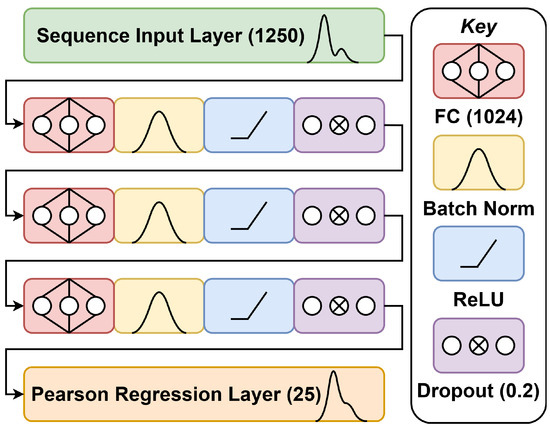 The final network is a sequence-to-sequence regression network consisting of the input layer, three hidden layers, and the output layer, which used the custom Pearson correlation loss function. The hidden layers are standard fully connected (fc) layers of 1024 neurons each, followed by batch normalisation layers and rectified linear unit (ReLU) activation layers. It is common to use ReLU activation, since they are computationally inexpensive and prevent vanishing gradients. Activation layers were followed by dropout layers with dropout factors of 0.2. The dropout factors result in a proportion of neurons being ignored, which prevents over fitting [26]. It effectively simulates many more architectures with different numbers of units in the layers. The architecture is illustrated in Figure 3.