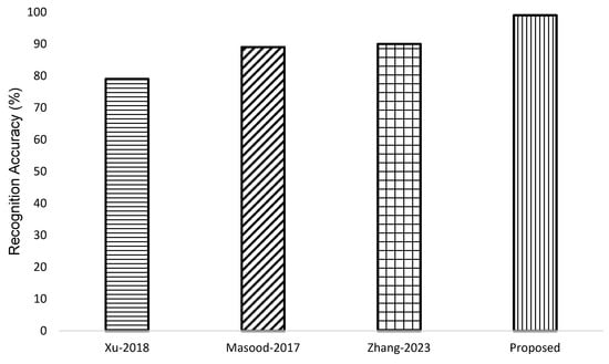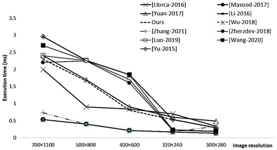 To perform the computational analysis of our developed method and the compared methods, we manually cropped the image resolutions. In our experiments, we selected different image resolutions, which are 700 × 1100, 500 × 800, 400 × 600, 320 × 240, and 300 × 280 pixels. From the compared works in this manuscript, we choose ten methods and executed them on the aforesaid image resolutions. Complete results are detailed in Figure 9. It is evident that the work reported by Yu et al. [41] and Li et al. [36] is computationally complex and consumes more than 3 ms to process the image resolution of 700 × 1100 to yield the final recognition result. Moreover, the works of Yuan et al. [34], Luo et al [42], and Wang et al. [43] also consume more than 2.5 ms to process the aforedescribed image resolution to generate the final resultant image. The works reported in Masood et al. [33] and Wu et al. [38] are computationally efficient and consume nearly 0.5 ms to process the test image for various image resolutions. Therefore, we observe that our developed technique takes slightly over 2 ms to deliver the final result. In terms of the execution time ranking, our developed method ranks fourth out of all of the compared methods. We observe that all the compared methods are near real-time for processing various image resolutions. Once an algorithm is trained on every dataset, our developed method along with other methods can be used in a resource-constrained environment, as we see that all the methods explored in this study work in near real-time in actual living environments with high accuracy.