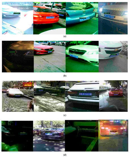 The CCPD dataset [40] is the largest publicly available LP dataset and has a collection of over 290,000 Chinese LP images. This dataset is separated into several categories according to the difficulty of identification, for instance, the illuminations on the LP area, the distance from the license plate when photographing, and the degree of horizontal and vertical tilts. The CCPD dataset also contains images in different weather conditions, such as rainy, snowy, or foggy. Each category includes 10,000 to 20,000 images. The CCPD-base consists of approximately 200,000 images, of which 100,000 are used for training and the other half are for testing. As listed in Table 5, the other sub-datasets, such as the CCPD-DB, the CCPD-FN, the CCPD-rotate, the CCPD-weather, and the CCPD-challenge, are also used during the test phase.