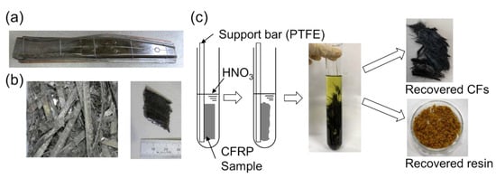 (a) CFRP automotive prototype waste manufactured from virgin carbon fibers and fully cured epoxy resin; (b) CFRP specimen used in this research, (c) decomposition and recovery process of carbon fiber and resin from CFRP immersed in HNO3.