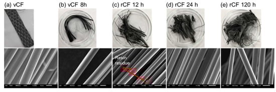 The results taken from the SEM observation of rCF are shown in Figure 3. No large amount of residual resin was observed on the surface of rCF 24 h, and rCF 120 h (Figure 3d,e). However, a slight amount of resin residue was observed topically on rCF 12 h (Figure 3c).