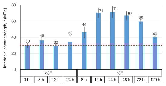 Interfacial shear strength between carbon fiber and resin at resin droplet size L = 70 μm for vCF, vCF 8 h–24 h, and rCF 8 h–120 h.