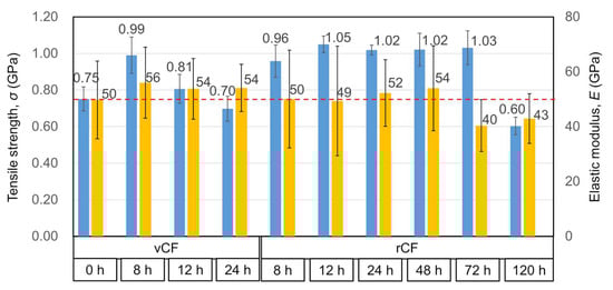 Tensile strength and elastic modulus obtained by tensile test for vCF, vCF 8 h–24 h, and rCF 8 h–120 h.