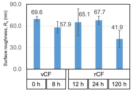 Using an AFM, shape imaging was performed to observe the carbon fiber surface shape and to evaluate the differences in the physical properties. Figure 6 shows the results of the surface roughness calculated by the shape image, shown in Figure A5. The surface roughness was Rq = 69.6 nm for vCF and it showed a slight decrease in vCF 8 h, rCF 12 h, and 24 h. The data variability was large in rCF 12 h compared to the other samples. This was considered to be due to the resin residue partially remaining on the rCF 12 h surface, which was also suggested in Section 3.1. It further declined to Rq = 41.9 nm in rCF 120 h. It has been reported that treatment with nitric acid smooths large grooves on the carbon fiber surface [19,20]. This was presumed to be the result of the nitric acid removing the weak and fragile parts of the graphite structure bonds formed on the CF surface during the manufacturing process [19,21]. Since the same phenomenon was confirmed in this research, it was suggested that the fragile layer of the graphite structure that existed on the surface was removed by nitric acid.