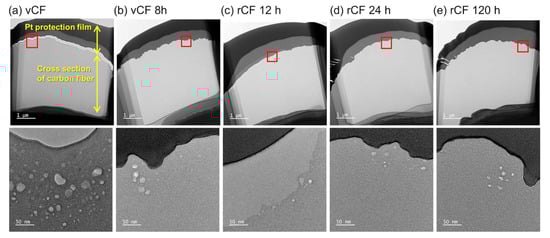 The results taken from the TEM observation of the carbon fiber cross-sections are shown in Figure 7. First, the vCF TEM observation results showed that voids were present in an area of 400 nm inward from the carbon fiber surface. The size of the voids ranged from 1 nm to approximately 30 nm. Wu et al. confirmed the presence of voids, approximately 10 to 30 nm in size, inside the carbon fibers [20]. They showed that the voids are formed by gas generated during the manufacturing process, and the size and shape vary depending on the amount and type of gas generated [23]. The TEM observation results for vCF 8 h and rCF 12 h to 120 h confirmed the presence of voids; however, the voids located 50 nm inside from the outermost layer, were located much closer to the surface than in the vCF. The results of the void content in the observed carbon fiber cross-sections are summarized in Table 2, which were quantified using image analysis software Image J (ver. 1.52a). The results showed that the abundances of voids in vCF 8 h and rCF 12 h to 120 h are 1/3 or less than the abundance of those in vCF. Based on the results above, and as also indicated in the AFM observation results, the reduced abundances of voids and the movement of voids to the top surface layer was considered to be due to the removal of the voids together with the surface layer graphite structure caused by nitric acid [19,20,21].