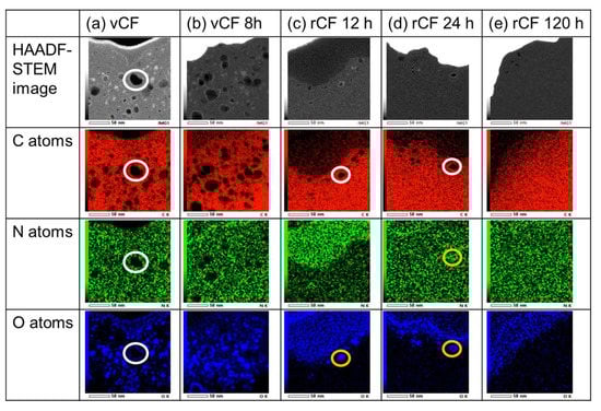 The results from the EDX mapping of target elements C, N, and O for the observed voids are shown in Figure 8. Neither C, N, nor O was found inside the voids of the vCF. On the other hand, inside the voids of vCF 8 h and rCF 12 h to 120 h, C was not found, while N and O were detected, in which a high concentration of O was confirmed.