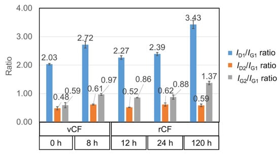 The results of a Raman spectrum acquired through the Raman spectroscopic measurements are shown in Figure A6a. A fitting to four peaks (D1, D2, G1, and G2 peaks) was performed using the Voigt function (Figure A6b). It is known that the G1 band (1600 cm−1) indicates C=C bonds, the G2 band (1500 cm−1) indicates amorphous carbon, the D1 band (1360 cm−1) indicates surface defects and the disruption of the graphite structure, and the D2 band (1230 cm−1) indicates C-H bonds [19]. The areas of the D1, D2, G1, and G2 peaks were calculated, and the results from calculating the ratios relative to the G1 band peak area are shown in Figure 9. ID1/IG1 ratios were taken to compare the surface defects and structure disruptions in each specimen, and there was no large difference between rCF 12 h or 24 h compared with vCF. However, in vCF 8 h the ratio was 1.3 times higher than vCF, and in rCF 120 h the ratio rose to 1.7 times higher than the vCF. When the IG2/IG1 ratios, which indicate the abundance of amorphous carbon, were compared, rCF 120 h showed a significantly higher value than the vCF, indicating an increase in the abundance of amorphous carbon. Based on the results above, this suggests that disruption occurred in the surface graphite structure in rCF 120 h, and its crystallinity was reduced.
