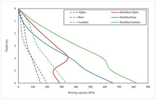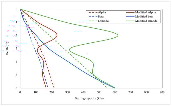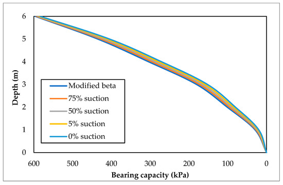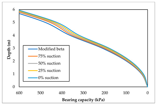 Moreover, it can be seen that the reduction in the matric suction decreases the bearing capacity of a pile, which will lead to an extreme settlement, tension cracks in the foundation, and even the collapse of the foundation [24,37]. However, the effect of matric suction on the bearing capacity using the modified β method is not severe. It can be explained by the degree of saturation of the soil. When the matric suction decreases, the positive change in the degree of saturation compensates the effect on the shaft capacity. On the contrary, the bearing capacity using the modified and methods was greatly affected by matric suction. The maximum bearing capacity of the Type 2 pile using modified and was 285.76 kPa and 821.8 kPa, respectively.