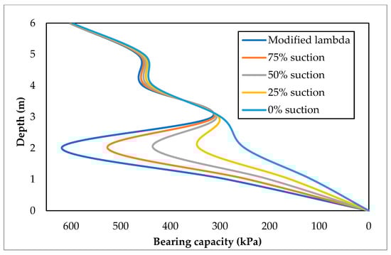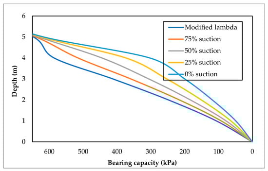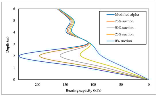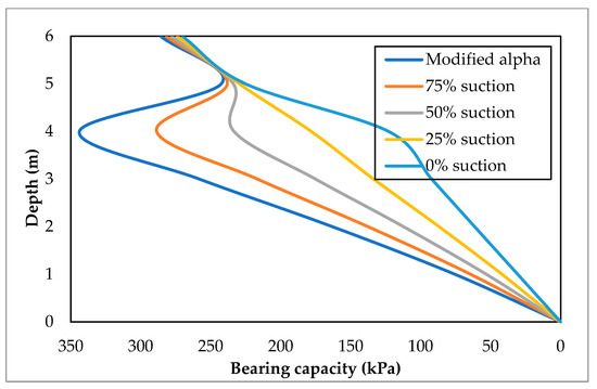 To show the effect of the variation in matric suction, the original data were decreased by 100%, 75%, 50%, and 25%. The reduction in the matric suction is related to a total cohesion method, where the matric suction is considered as a “percentage of hydrostatic pore water pressure” [34]. The infiltration of the rainwater can decrease the matric suction in the upper layers and affect the factor of safety [34]. Figure 5, Figure 6, Figure 7, Figure 8, Figure 9 and Figure 10 show the comparison of the resultant values for shaft bearing capacities.