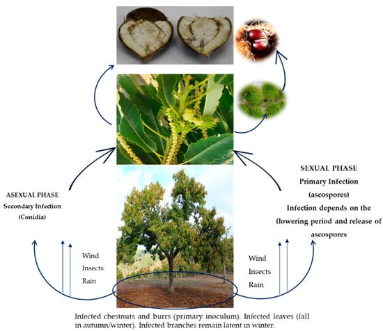 The life cycle of G. smithogilvyi and the process of how to infect chestnut have not yet been fully known. According to Shuttleworth and Guest [], the primary infection is caused by ascospores that spend the winter on the infected plant debris lying on the soil surface of chestnut groves. During the flowering period, these ascospores are transported to flowers, leaves, and branches by wind and wind-driven rain and insects [] (Figure 1). The fungus infects only the female part of the flower (pistil) through the stigma–style and not through the ovary wall []. The appearance of multiple embryos in the fruit, where one is rotted and the other healthy, suggests that the pellicle surrounding each embryo is impervious to the fungus []. Additionally, the infection of female flowers may also occur via G. smithogilvyi-infected pollen. The main means of entry into the other plant organs, such as branches and leaves, is through wounds caused by mechanical or natural injuries [].