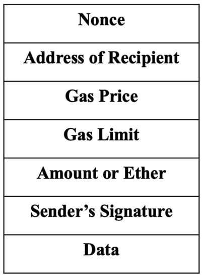 A transaction is a data packet for transferring an ether from one wallet to another. In our proposed method, the data field is used to store user IDs, and a smart contract is used to check cloud-based data requests from users. The transaction structure is illustrated in Figure 1.