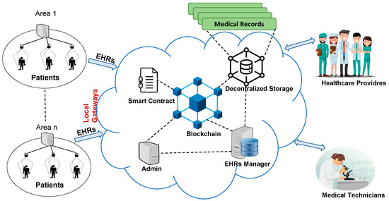 In the proposed healthcare system, all data are collected from a local network channel and stored in a public cloud, in which medical records are shared among authorized patients and healthcare providers. Medical records include patient data, patient ID, and area ID, indicating where the patient resided. Figure 2 depicts the proposed blockchain-based healthcare system.