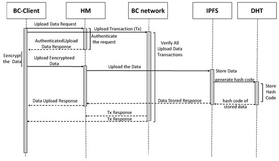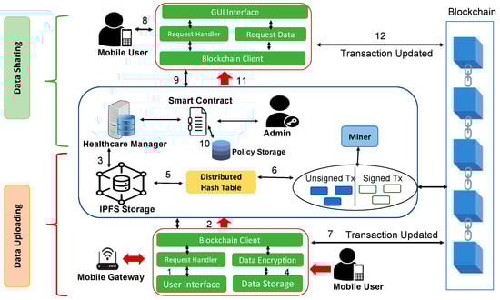 In this section, we implement secure data-upload and data sharing mechanisms by utilizing smart contracts and blockchains. The use of smart contracts enables high productivity and transparency in the automated management of blockchain transactions. We built decentralized user modules for smartphones; the decentralized modules provide basic functionalities to users to interact with the blockchain network throughout the cloud. This layer is responsible for encoding transactions and data demands, generating digital signatures for transactions, and connecting to the blockchain to monitor transaction activities. In addition, the user interface module is intended to communicate with the user and request a controller unit to manage the user request information. The workflow of the operations for uploading and exchanging EHRs is shown in Figure 6. The description of every sequence of iterations is as follows: