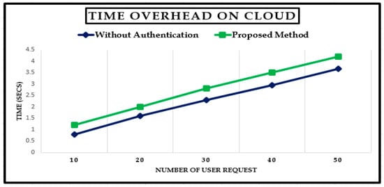 The average time required to evaluate several access user requests in the cloud was calculated (Figure 8). Compared to the approach without an authentication mechanism, our proposed system, which encompasses access control on smart contracts, takes longer to execute service requests. The time spent on identity management and authorization confirmation was added to this cost. However, the increased cost was approximately 5 s in the worst-case scenario—50 queries. Thus, it is considered to be minimal and appropriate for real-world situations. This result demonstrates the compact architecture of the proposed model for user authentication and authorization management.