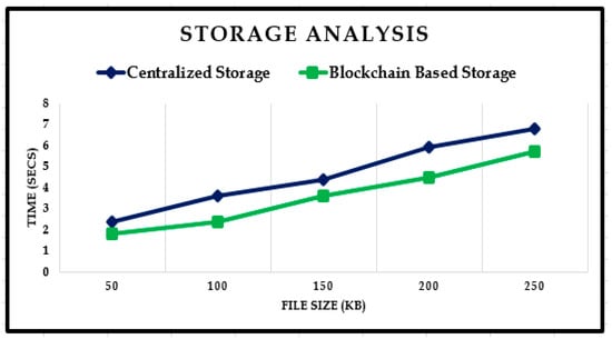 In addition, we demonstrate the capability of our EHR distribution system through the computational complexity of acquiring EHRs for the IPFS blockchain cloud storage (Figure 9). We analyzed the amount of time it took to complete the EHR access process, from the time of demanding data access to the time of obtaining information on a smartphone. In addition, we investigated the time efficiency of EHRs using a blockchain-based repository, IPFS, versus a central server supported by a simple storage service (S3). The findings of the evaluation, considering various large EHR files, reveal that our distributed storage solution on the blockchain is faster (takes less time) than the centralized storage strategy to access data.