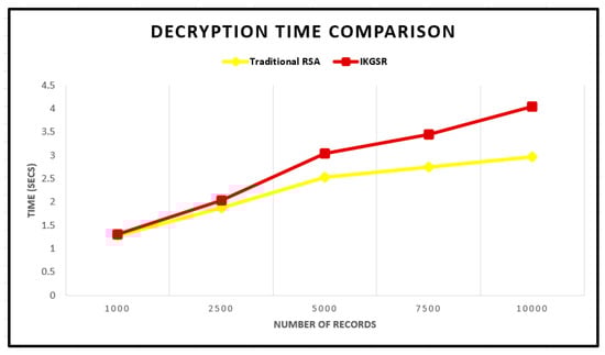We have already introduced the IKGSR [31] algorithm to enhance the security of asymmetric algorithms in cloud environments. In the proposed environment, we tested IKGSR against the traditional RSA algorithm. Figure 10 and Figure 11 clearly show that IKGSR requires more time to encode and decode input health data. However, the IKGSR algorithm offers high security as well as security against chosen ciphertext and timing attacks, as shown in [31].