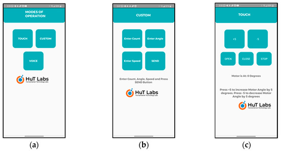 Figure 4. Developed smartphone app. (a) Three modes of operation supported: touch, voice, and custom. The custom mode is part of the touch mode of operation and can be considered as auto mode. (b) Using custom mode, the therapist/user can enter the control parameters: count, angle, and speed. (c) Using touch mode, the therapist/user can specify the angle and use OPEN/CLOSE buttons for operation of the wearable device. - Smartphone-based Touch Control: This is similar to the speech-based app except that it uses a touch-based app of the smartphone. Using the touch-based app, the therapist or the user can choose the angle control parameters and touch the OPEN/CLOSE (control command) button as shown in Figure 3c to operate the wearable. In the initial phase of the therapy, the therapist can use this option to carry out the therapy slowly and steadily and train the users. Once the therapy reaches a stage where the users can operate the wearable themselves, then they can begin the operation with the touch control and gradually move to voice control or custom control which is similar to autonomous control.