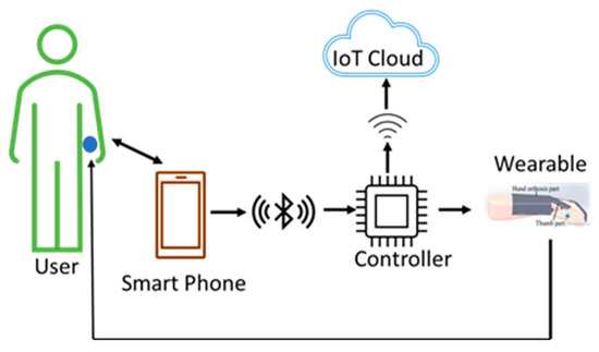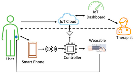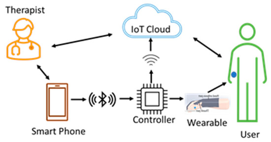 This architecture, shown in Figure 6, can be used by therapists at the hospitals where therapy begins for the patients. The therapist teaches and trains the users with smartphone-based control methods so that the users can continue with therapy on their own when they move to their residence. Training and allowing the users to continue with the therapy, using a wearable at their residence, reduces the financial burden on users to a great extent. The data from the sensors, the control commands, and the key parameters are stored in the cloud for future reference and analysis.