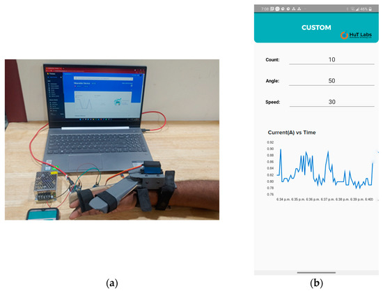 (a) The wearable device with a user’s hand, along with fixed and mobile gateways. (b) Live feedback from the smartphone while the wearable device was in operation. The control parameters and the current sensor graph are displayed.