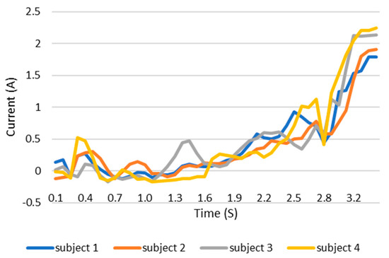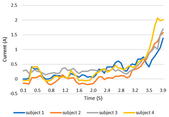 When users grip an object, the load current of the wearable system increases. This increase in current can be monitored and the grip force can be measured as the current can be related to the torque. This current, which is measured using a current sensor, is an indicator of whether the user is holding the object properly or not. The current measurement tests are carried out with the same three objects as in the previous test. The results are shown in the Figure 12, Figure 13 and Figure 14. These figures show the variation in the current of digital servo motor in amperes with respect to the angle of the thumb part, when the users are trying to grasp and grip an object. The sudden overshoot in the graphs helps in determining the presence of an object at a particular angle. We can observe that the overshoot in Figure 14 (for paint bottle) occurs as early as 37° compared with the other two objects’ (the ball and water bottle) current characteristics in Figure 12 and Figure 13. As the paint bottle is heavier than the other two objects, the current overshoot starts earlier. Figure 12, Figure 13 and Figure 14 were plotted by collecting the data for 200 iterations of each user picking each of the three objects. As the current measurement is independent of the control method, i.e., voice and touch, we only used the touch control method for this test.