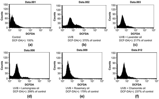 Effect of essential oils on ROS production in UVB-irradiated DPCs. FACS analysis to detect the DCF-DA-positive cells was performed. (a) Control DPC. (b) UVB-irradiated DPC; and (c) Lavender oil-treated, UVB-irradiated DPC. (d) Lemongrass oil-treated, UVB-irradiated DPC. (e) Rosemary oil-treated, UVB-irradiated DPC. (f) Chamomile oil-treated, UVB-irradiated DPC. The average number of DCF-DA-positive cells shown in (a) is designated as 100%.