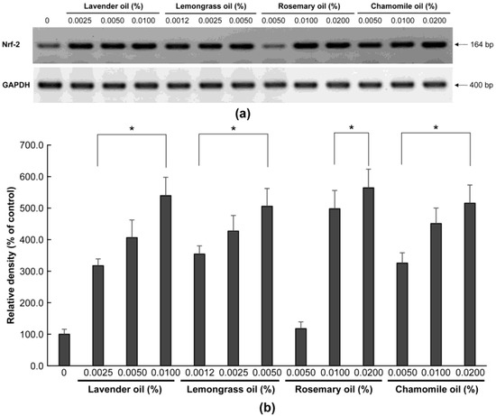 Dose-dependent induction of NRF-2 mRNA expression in essential oils-treated DPC. (a) The DPCs were treated with lavender oil (0.025–0.01%), lemongrass oil (0.0012–0.005%), rosemary oil (0.005–0.02%), or chamomile oil (0.005–0.02%). GAPDH was used as an internal standard to quantify the loading dose of mRNA. The figure shows representative results of triplicate RT-PCR experiments. (b) NRF-2 mRNA level is quantified by densitometric analysis * p < 0.05.