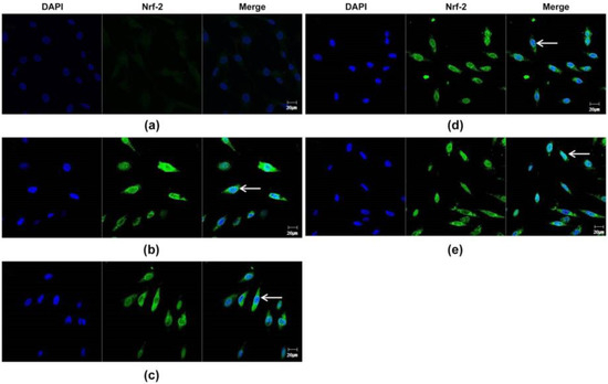 Confocal microscopic detection of Nrf-2-positive fluorescence in plant essential oils-treated DPC. (a) Nrf2-positive fluorescence signals from non-treated DPCs (control). (b) Nrf2-positive fluorescence signals from lavender-treated DPCs. (c) Nrf2-positive fluorescence signals from lemongrass-treated DPCs. (d) Nrf2-positive fluorescence signals from rosemary-treated DPCs. (e) Nrf2-positive fluorescence signals from chamomile-treated DPCs. The arrow represents nuclear translocation of Nrf2. Scale bar: 20 μm.