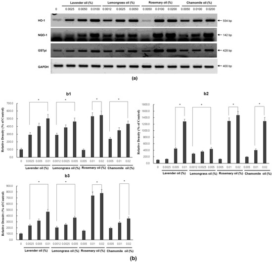 Dose-dependent induction of the mRNA expression of phase II enzymes in essential oils-treated DPC. (a) The DPCs were treated with lavender oil (0.025–0.01%), lemongrass oil (0.0012–0.005%), rosemary oil (0.005–0.02%), and chamomile oil (0.005–0.02%). The figure shows representative results from triplicate RT-PCR experiments. (b) Phase II enzymes mRNA level are quantified by densitometric analysis * p < 0.05.