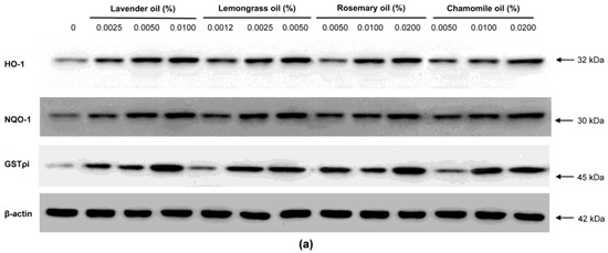 Since all essential oils had the potential to activate NRF2, further experiments were performed to test whether they could upregulate the expression of downstream target antioxidant proteins. As representative antioxidant proteins of phase II enzymes, we focused on HO-1, NQO-1, and GSTpi expression in DPCs. In RT-PCR experiments followed by densitometric analysis, the mRNA expression levels of our phase II enzyme genes were found to be upregulated in a dose-dependent manner (Figure 4a,b). Consistently, Western immunoblots demonstrated that essential oils upregulated HO-1, NQO-1, and GSTpi protein levels in a dose-dependent manner (Figure 5a,b). These results show that a set of phase II enzymes expressed in human DPCs were upregulated by essential oils, suggesting that DPCs express sufficient NRF2 and downstream target proteins to cope with the oxidative stress.