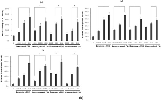 In RT-PCR experiments, all essential oils were found to upregulate VEGF and IGF1 mRNA expression levels in a dose-dependent manner (p < 0.01) (Figure 6a,b).