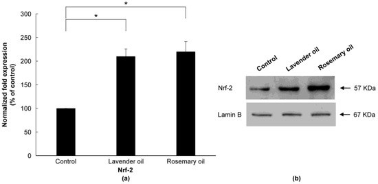 Upregulation of NRF-2 by lavender (0.01%) and rosemary (0.01%) oils in the 3D-DPC culture system. To confirm the results of the 2D-DPCs culture system, cells were treated with essential oils in the 3D-DPC culture system. (a) NRF-2 mRNA levels are qRT-PCR experiments. * p < 0.01 between the essential oils-treated samples and non-treated control DPCs. (b) NRF-2 protein expression was analyzed by Western immunoblots.