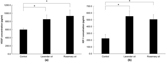 Upregulation of hair growth factors by lavender (0.01%) and rosemary (0.01%) oils in the 3D-Dermal papilla cell (3D-DPC) culture system. To confirm the results of the 2D-DPCs culture system, cells were treated with essential oils in the 3D-DPCs culture system. (a) VEGF mRNA expression was analyzed by qRT-PCR. * p < 0.01 between the essential oils-treated samples and non-treated control DPCs. (b) IGF-1 mRNA expression was analyzed by qRT-PCR. * p < 0.01 between the essential oils-treated samples and non-treated control DPCs.