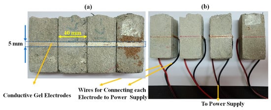 To heat the prisms, the DC (Direct Current) power supply should be able to regulate current up to 5 A and voltage to 30 V for electrical heating. For electrical heating, a conductive gel is painted on one surface of each piece and its opposite side along the bisecting line of the piece in its length direction in order to have the shape of a rectangle with dimensions of 40 mm × 5 mm. The rectangle shape is selected to observe the heat diffusion to its two sides. Figure 1 shows the electrode preparation in each prism piece; the electrode connection is also shown. A conductive gel electrode with a thickness of 5 mm is drawn on one surface of each piece. On the opposite surface of the piece, another electrode with the same dimension and direction as the first one is drawn. The electrode is located near the middle area of each piece. One of the electrodes is connected to the ‘+’ terminal of the power supply and the other to the ‘–’ terminal or ground terminal through electric wires. These wires are in contact parallel to the long side directions of their corresponding electrodes. The typical resistivity of the conductive glue is around 0.09 Ω·cm to 0.0001 Ω·cm []. The resistivity can go up several tens percent more when it is heated [], but it is still very small compared with that of the dried prisms/concrete, which is in the range of 100 Ω·cm to 1,000,000 Ω·cm [].