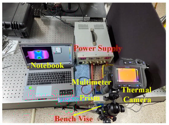 Through the wires, 30 W of power was applied to each prism for up to five minutes. Therefore, the total energy deposited to each prism is 9 KJ (30 W × 60 sec × 5 Min.). FLIR T640 thermal camera, which has a pixel resolution of 640 × 480, a pixel size of 17 µm and temperature resolution of 0.03° K at 30 °C, was used to determine the surface temperature distribution of the prism, before applying the power and every thirty seconds of heating. The thermal image from this camera can show the heating level of the test objects with a temperature distribution represented by a different color combination.