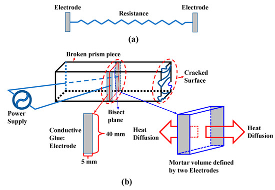 Figure 3 shows an equivalent electrical circuit of the prisms (Figure 3a) and electrical connection diagram of the experimental set-up (Figure 3b). The equivalent circuit can be represented as the two electrodes and the resistance represents the total resistance of the volume. In practice, the volume that provides the current path will always exceed the minimum volume because the fibers, which are the main current path in the prism, are randomly directed, aligned and distributed in the form of a strand, strands, bunches and balls [,]. This means that there may not be any uniformly connected path between the electrodes and, hence, the lowest resistance path may not always be the straight line normal to the electrodes. The path is defined by the size and amount of the clustered fiber strands and their aligned and connected directions. In each position of this path, the fibers are differently heated by the current because of the resistance differences for various positions. The path has a non-uniform heat distribution. Therefore, the minimum volume is hardly identified. The path works as the heat source because the electric power is deposited to the path. The heat from the path radiate, convect to the surrounding space and diffuse to its neighboring volumes. By diffusion, the entire prism is heated. This is why the temperature distribution along the length direction of the prism may reveal the heat diffusion/distribution pattern.