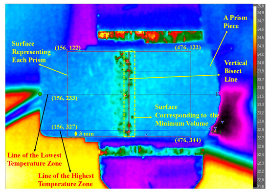 Along with the averaged surface temperature, observed are the temperature distributions of the horizontal line that bisects the prism piece into two horizontal parts and another horizontal line at 3 mm distance from the bottom edge of the piece. The former represents the lowest temperature and the latter represents the highest temperature zone of the heated prism. The bisecting horizontal line will pass the pixels (156, 233) and (156, 327), and the other line will pass the pixels at (156, 233) and (156, 327) in Figure 4. These temperature distributions are used to show the heat diffusion pattern of the prism. The relative positions of the lines and sizes of the rectangles in other percentage prisms are also the same.