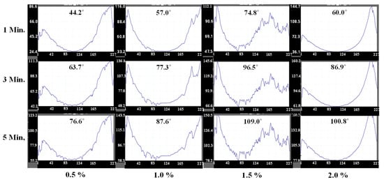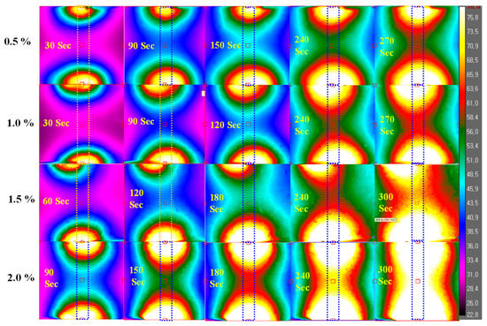 The amount of the diffused heat reduces as the radius of the circle increases and the area between these two half circles, i.e., the middle part of the prism is heated less due to its smaller resistance compared with the near-electrode parts. This makes the temperature of the middle part much lower than the electrode side. However, as the heating time increases, a clearly visible heated corridor having a width comparable to the dotted rectangle in each image appears between these two circles, as shown in the 270 sec image of 0.5%, 240 sec images of both 1.0% and 1.5%, and 180 sec image of 2.0%. These corridors identify the presence of the minimum volume. The further increase in the heating time induces the circles to contact and overlap with each other, as shown in the 300 sec image of 1.5% and the 240 sec and 300 sec images of 2.0%. Figure 5 also shows that the circles have bigger radii as the fiber percentage increases.