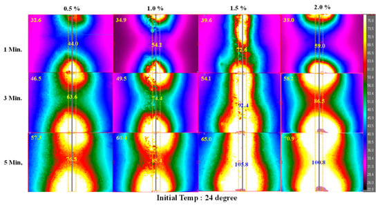 The average temperature increment is within 20.2° (0.5%) to 50.8° (1.5%) for first 1 min, 19.5° (0.5%) to 26.9° (1.5%) for 1 to 3 min, and 10.3° (1.0%) to 13.9° (2.0%) for 3 to 5 min. The temperature increment is the highest for the first 1 min of heating and then reduces as the heating time increases. In fact, the temperature increment for the first 1 min is much higher than those for 1 to 3 min and 3 to 5 min. These increment characteristics closely match those of the broken rectangles specified in Figure 6. However, the average temperature of the surface does not follow this increment pattern.