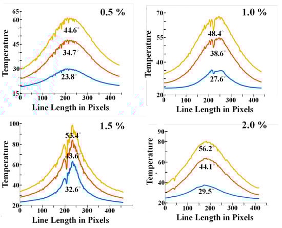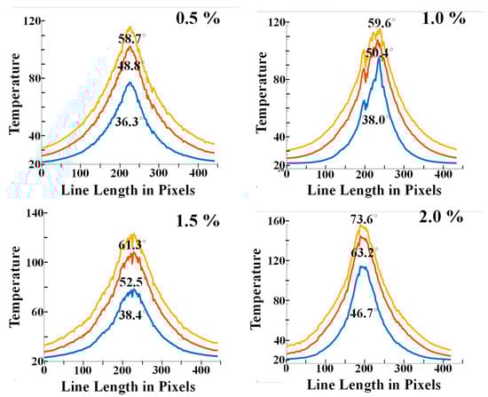 Figure 4 shows the full frame thermal image of a piece of a 1.0% prism to specify the surface area for determining the average temperature and the lines to show the heat diffusion/temperature distribution patterns of the different percentage prisms. The total resolution of the image is 640 × 480, but the surface area of the piece is approximately 444 × 222 pixels. The trace of the discarded conductive gel electrode is also shown in the middle of the prism. The vertically aligned rectangle in this trace represents the location of the minimum volume defined by the 5 mm width electrodes. Since the 222 pixels correspond to 40 mm, the width of the rectangle corresponds to 28 (~222 × 5/40) pixels.