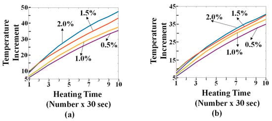 Figure 10 presents graphical comparison of the variation in the average temperature increment of the surface with the heating time for four percentage prisms. The temperature values in this graph are obtained by averaging the temperature increments of the prisms shown in Figure 5 and Figure 6 (Figure 10a). Since there are some differences between prism weights and the electric power applied to the prisms, these differences should be compensated for accurate comparison. For this purpose, the weight is normalized in the way that is described in Section 2, while the electric power shown in Table 2 and the weight are the same as for 30 W. The compensation factors are calculated as 0.982 for the 0.5%, 1.0 for the 1.0%, 0.924 for the 1.5%, and 0.853 for the 2.0% prism. Figure 10a is compensated by these normalization factors as shown in Figure 10b. Figure 10a shows that: