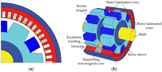 The SHG magnetic core has two SRSCs linked to each other in the axial direction by the stator housing and the rotor sleeve made of non-laminated low-carbon steel. The excitation winding fixed on the stator induces the excitation flux, which passes through the SRSCs, the stator sleeve on the rotor shaft, and the stator housing [8,30] (see Figure 3). The modulation of the magnetic field by the teeth of the rotor allows this magnetic flux to interact with the poles of the armature winding on the stator. In the absence of magnets, only half of the poles would be involved in the torque production. The addition of permanent magnets between the teeth of the rotor makes all poles of the armature winding to usable [31,32].