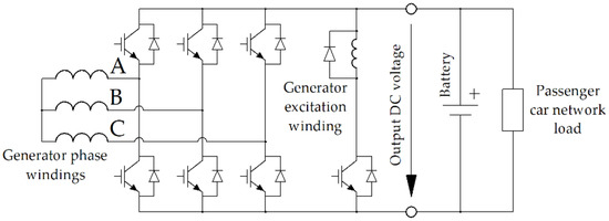 Figure 2 shows the scheme for rectifying the output current of the generator to the network of the car. The generator feeds the network of the car, and also recharges the battery. The rectifier uses controlled transistor switches that provide vector control of the generator armature winding current. The concentric coil of the excitation winding is located between the pairs of rotor and stator stacks and is fixed on the supporting non-magnetic core. The DC-link voltage (close to the maximum amplitude of the line-to-line voltage of the generator) must not exceed 116 V. The semiconductor converter also includes a single-phase breaker for powering the excitation winding of the generator.
