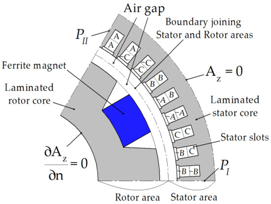 The calculation area is one sector corresponding to the pole pitch of the generator, with periodic boundary conditions PI and PII on the boundaries of this sector, as shown in Figure 4. The change in the rotor angular position is modeled not by changing the geometry of the calculation area, but by changing the connecting boundary condition on a circular line lying in the middle of the air gap between the rotor and stator.