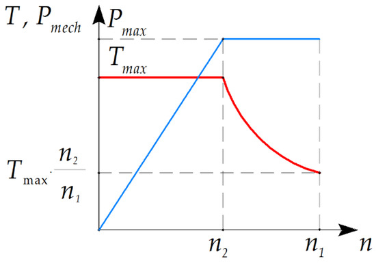 Like traction motors, an undercar generator is an electrical machine, operating over a wide range of speeds at a constant required output power. However, in the case of a generator, a constant electrical output is required. The rotational speed of an undercar generator increases along with the velocity of the train. The operating speed range of the considered undercar generator is from 750 to 3450 rpm. The generator must produce about 35 kW in this speed range [34]. In order to simplify the optimization procedure, it was assumed that the mechanical power of the generator does not change and is equal to Pmax = 40 kW > 35 kW in the entire considered speed range, roughly taking into account the generator loss. Two boundary points are considered in the optimization: the speed n1 = 3450 rpm at the torque of Tmax ∙ n2/n1 = 111 N∙m and the speed n2 = 750 rpm at the torque of Tmax = 510 N∙m (Figure 5).