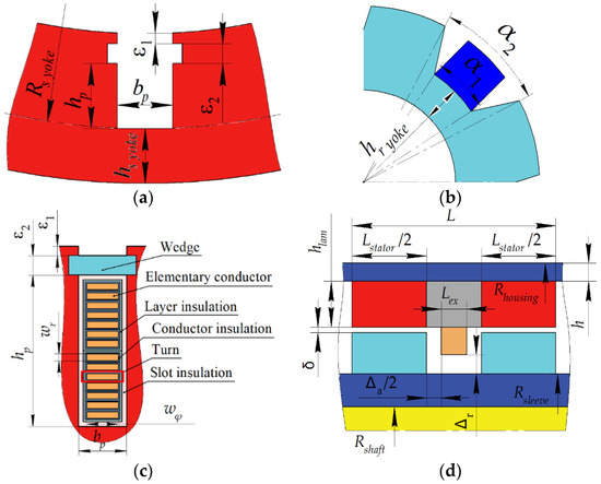Parameters of the SHG geometry. (a) Stator core parameters; (b) Rotor core parameters; (c) Armature winding parameters; (d) Parameters in the axial plane.