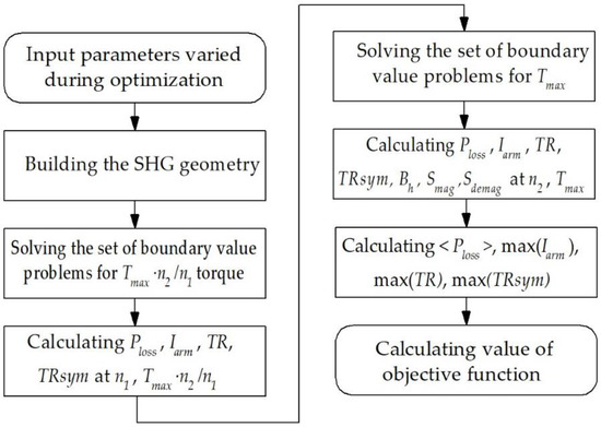 The iron loss is a key component of the total loss. Therefore, it is also evaluated for each intermediate design obtained during the optimization, i.e., at each step of optimization (each call of the objective function) based on the solution of g boundary problems. A conventional algorithm for calculating iron losses is used [33].