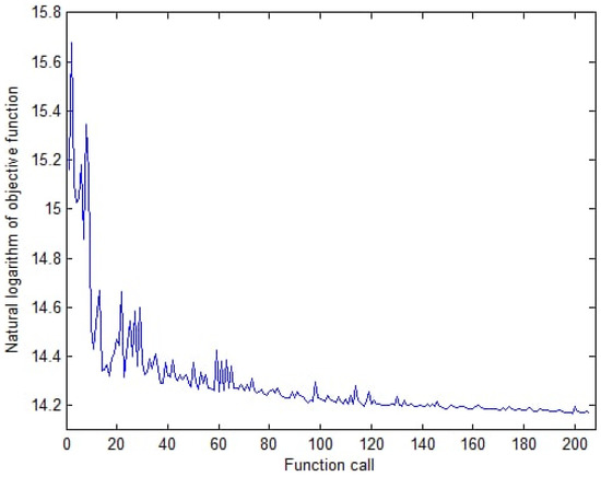As a result of optimization, the value of the objective function (6) converges to a minimum (Figure 8). The volume of the simplex can quickly decrease during optimization, and further optimization slows down. Therefore, after the 180th function call, the Nelder-Mead method was restarted. The optimal solution found was used as the initial approximation. The linear dimensions of the simplex at the restart were reduced by four times compared to the initial simplex. One function call takes approximately 20 min using a laptop with two cores, 2.70 GHz processor and 16 GB of RAM.