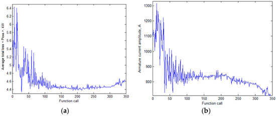 Change of the generator parameters during optimization: (a) Average losses; (b) Maximum magnitude of the armature winding current.